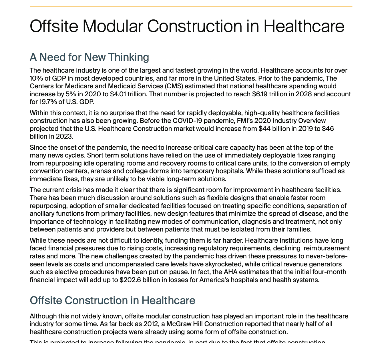 There are multiple reasons why the benefits of offsite modular construction are particularly relevant for today’s healthcare construction projects. This white paper describes how offsite modular can enable rapidly deployable, high-quality construction for healthcare, and discusses cases in which offsite modular techniques have been successfully used in the past.